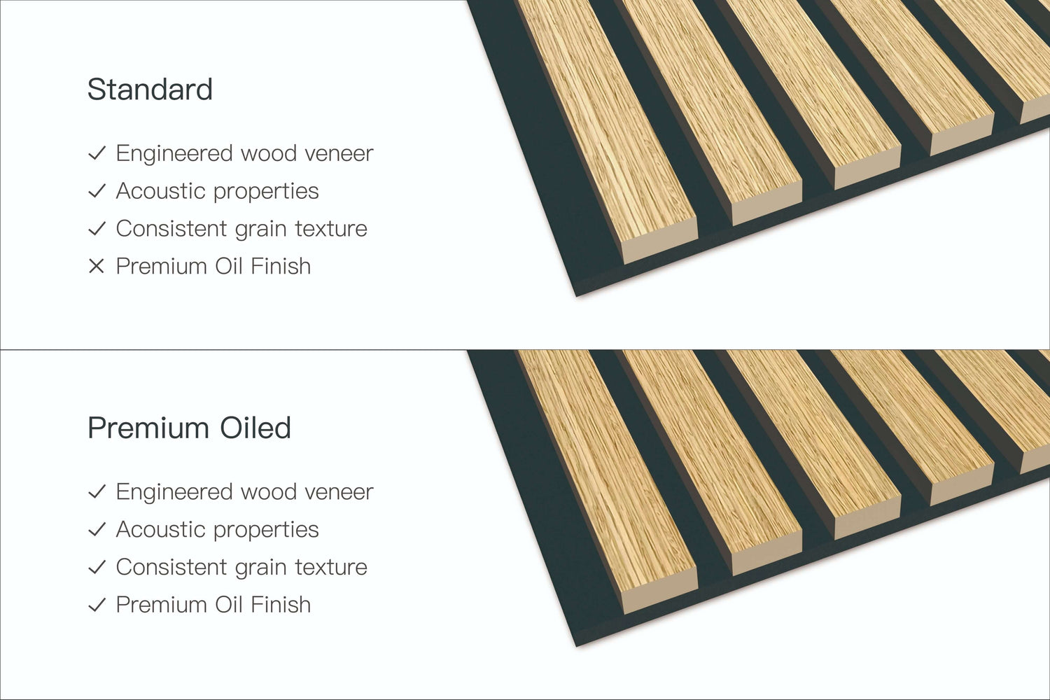 However, application of high quality oil film on the premium slat wood acoustic wall panels enhances the wood’s grain and deepens its colour, providing a richer, more polished appearance. The oil film can also offer added protection against moisture and wear, making the panels more durable over time. Both options maintain the acoustic performance, but the choice between them often depends on the desired visual effect and environmental conditions.